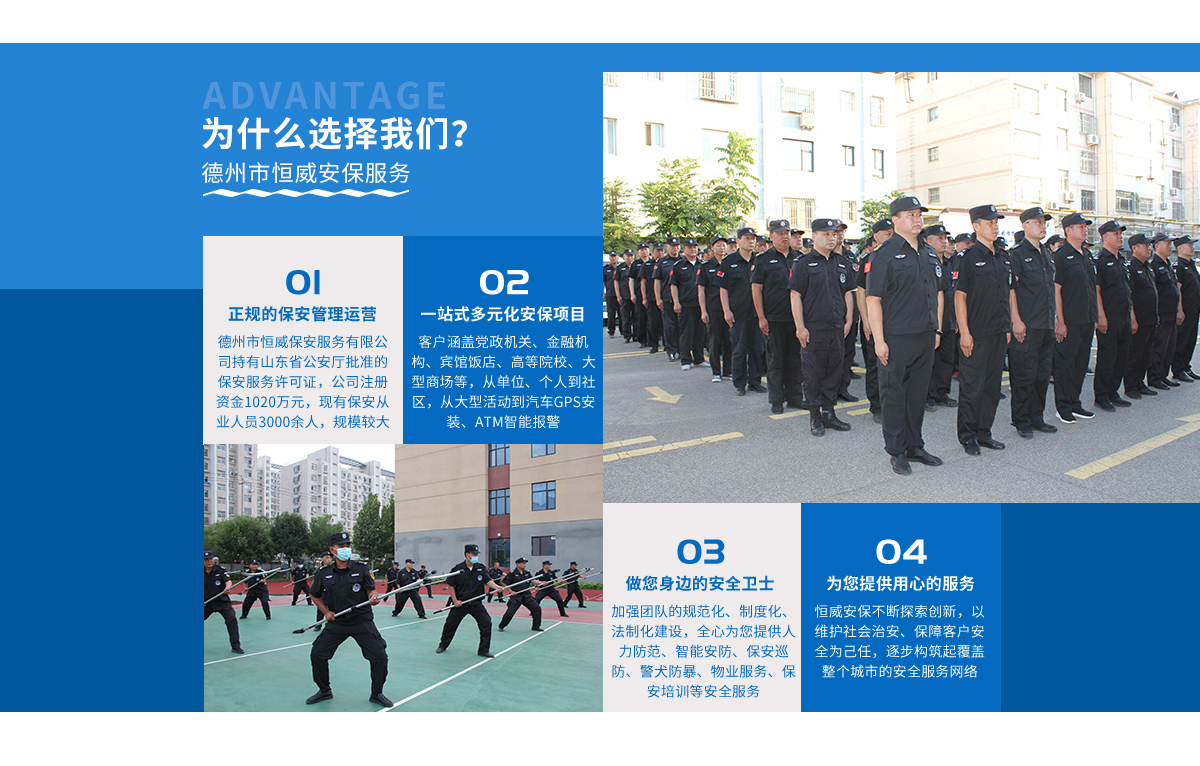 - 德州市恒威安保服務(wù)有限公司,注冊資金1020萬元。是經(jīng)山東省公安廳批準、德州市工商管理局登記注冊、具有獨立法人資格的專業(yè)保安服務(wù)公司,下設(shè)10個職能科室和業(yè)務(wù)部...
